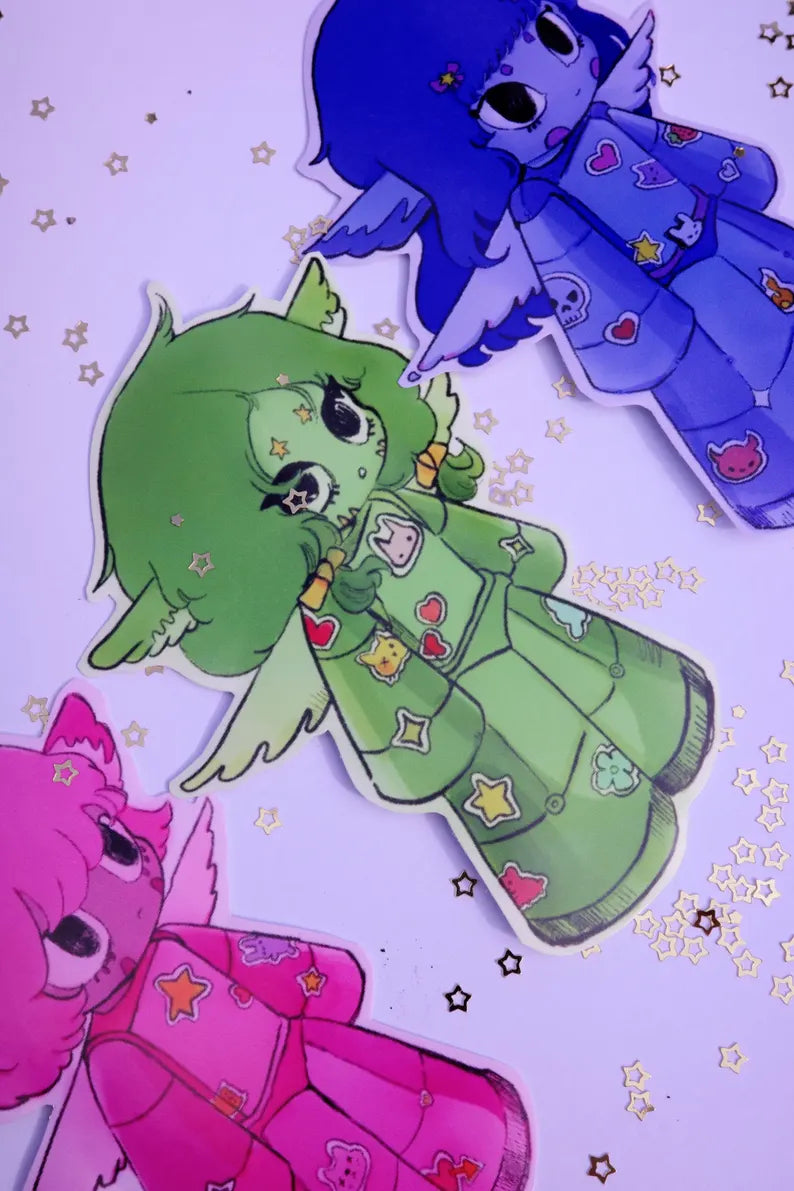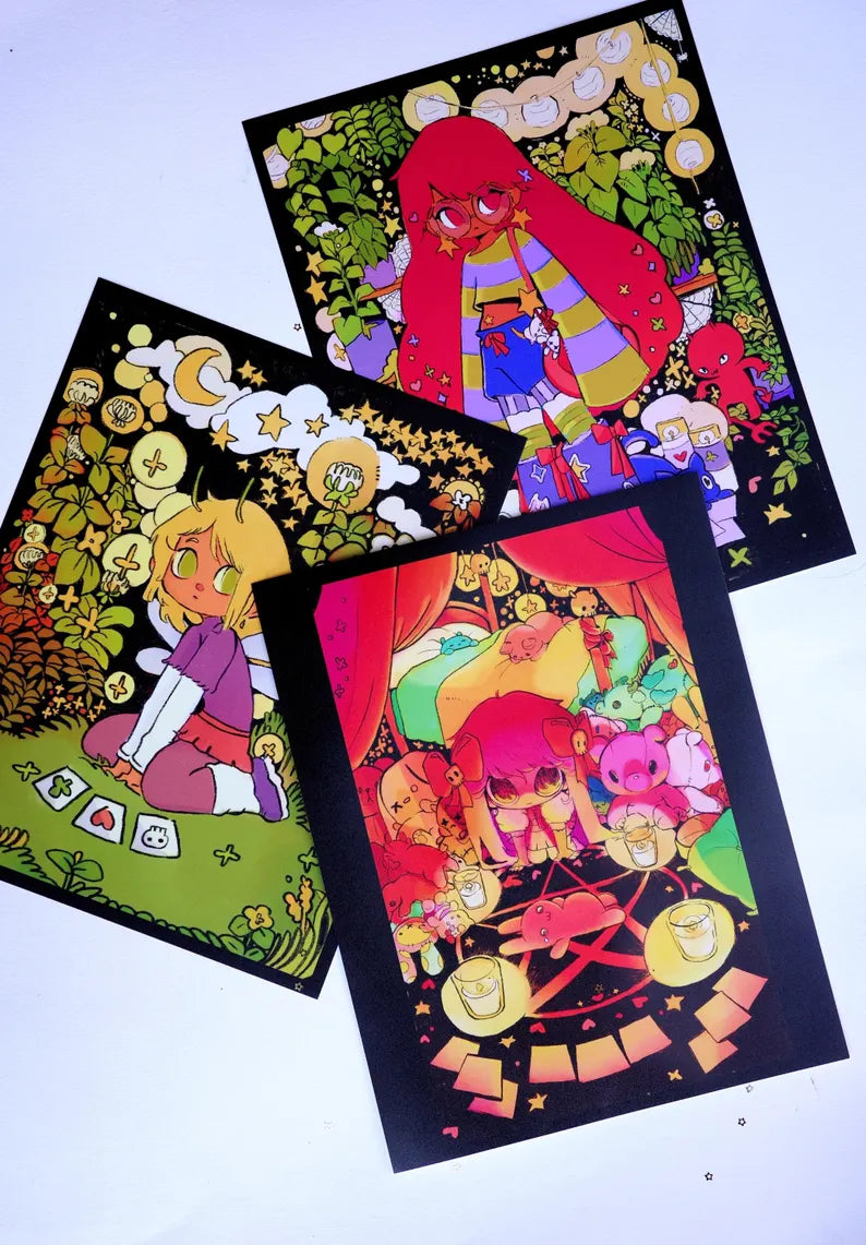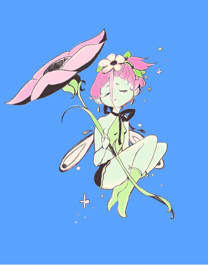 You can find prints and stickers made by us, the artists, Banshipuppy and Spitblossoms, on our individual Etsy shops! Just follow the links below ♥︎